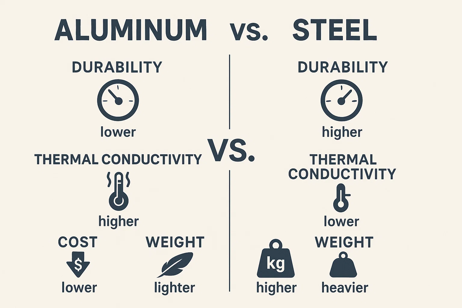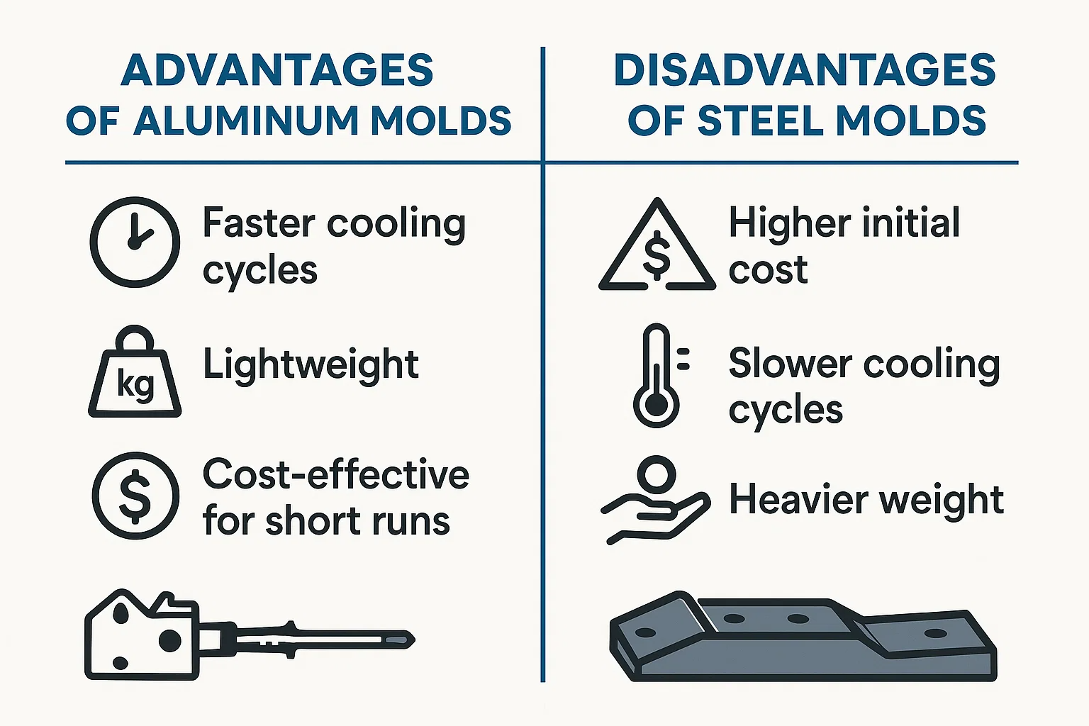 Chu kỳ làm mát chậm hơn: Độ dẫn nhiệt thấp hơn của thép có nghĩa là nó giữ nhiệt lâu hơn. Điều này kéo dài thời gian làm mát cho từng phần, dẫn đến Chu kỳ sản xuất chậm hơn và giảm sản lượng so với khuôn nhôm.