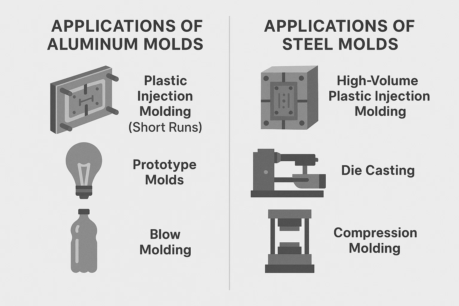 Trong sản xuấtThì khuôn phù hợp là rất quan trọng để tạo ra các bộ phận chất lượng cao. Vật liệu bạn chọn cho khuôn đó ảnh hưởng trực tiếp đến mọi thứ từ chi phí và tốc độ sản xuất đến chất lượng sản phẩm cuối cùng. Trong khi có nhiều vật liệu có sẵn, hai vật liệu nổi bật là phổ biến và linh hoạt nhất: nhôm Và Thép .