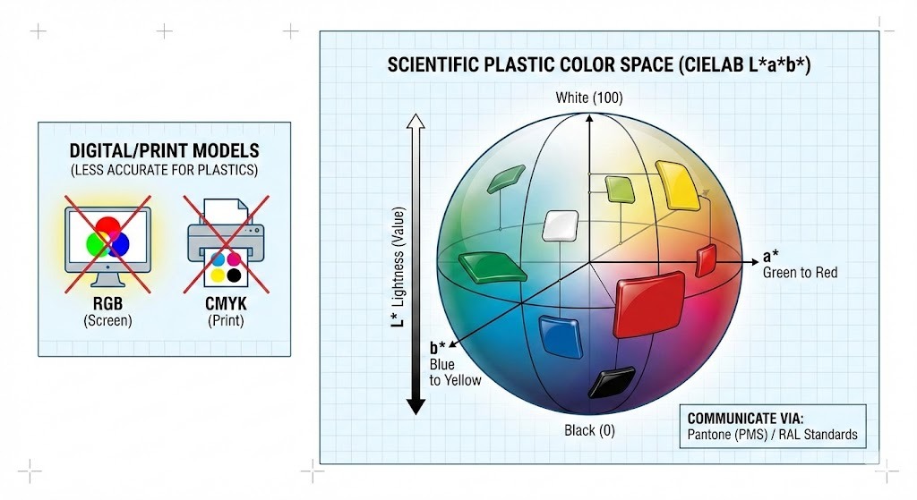 Trước khi đi sâu vào máy móc, điều quan trọng là phải hiểu cách hoạt động của màu sắc trong môi trường vật lý ba chiều như nhựa. Nhiều lỗi thiết kế xảy ra do các bên liên quan dựa vào các mô hình màu kỹ thuật số không chuyển đổi tốt sang sản xuất vật lý.