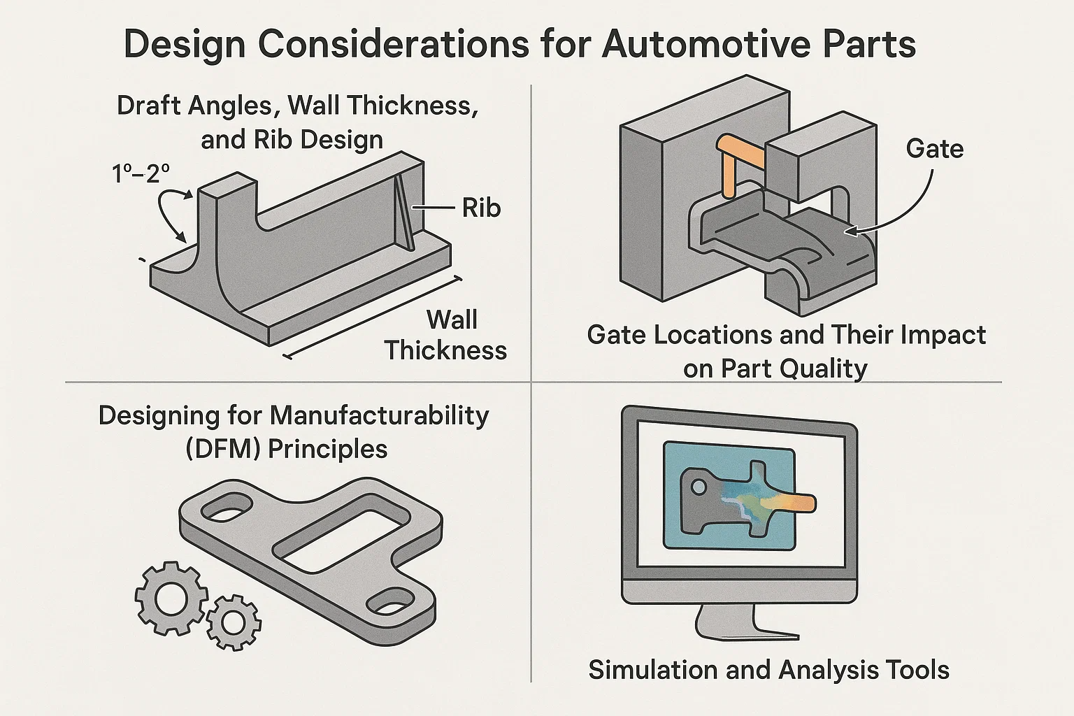 Thành công của việc tiêm đúc và quá mức các bộ phận ô tô bản lề trong quá trình thiết kế tỉ mỉ. Một phần được thiết kế tốt không chỉ là chức năng mà còn có thể sản xuất, bền và hiệu quả về chi phí. Tuân thủ các nguyên tắc thiết kế cơ bản là rất quan trọng để tránh các vấn đề phổ biến như cong vênh, liên kết yếu và khiếm khuyết mỹ phẩm.