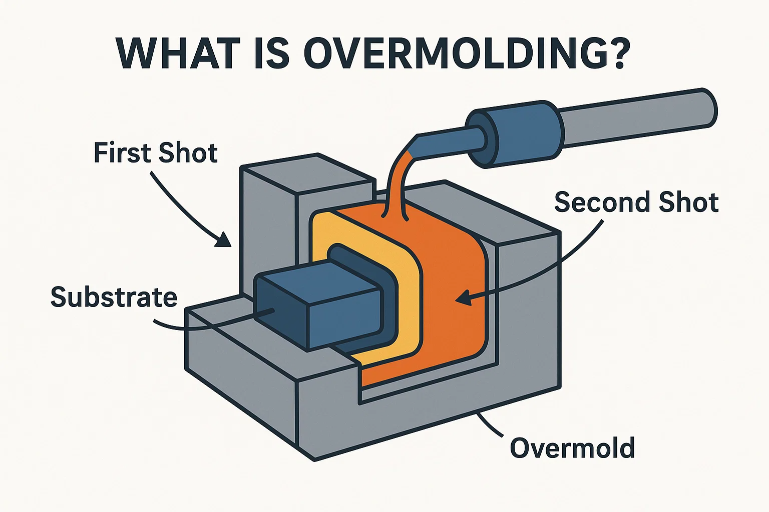 Overmolding là một quá trình hai bước tuần tự trong đó vật liệu thứ hai được đúc trên một phần rắn, có sẵn. Đây là lý tưởng để thêm một lớp mềm vào một cơ sở cứng nhắc.