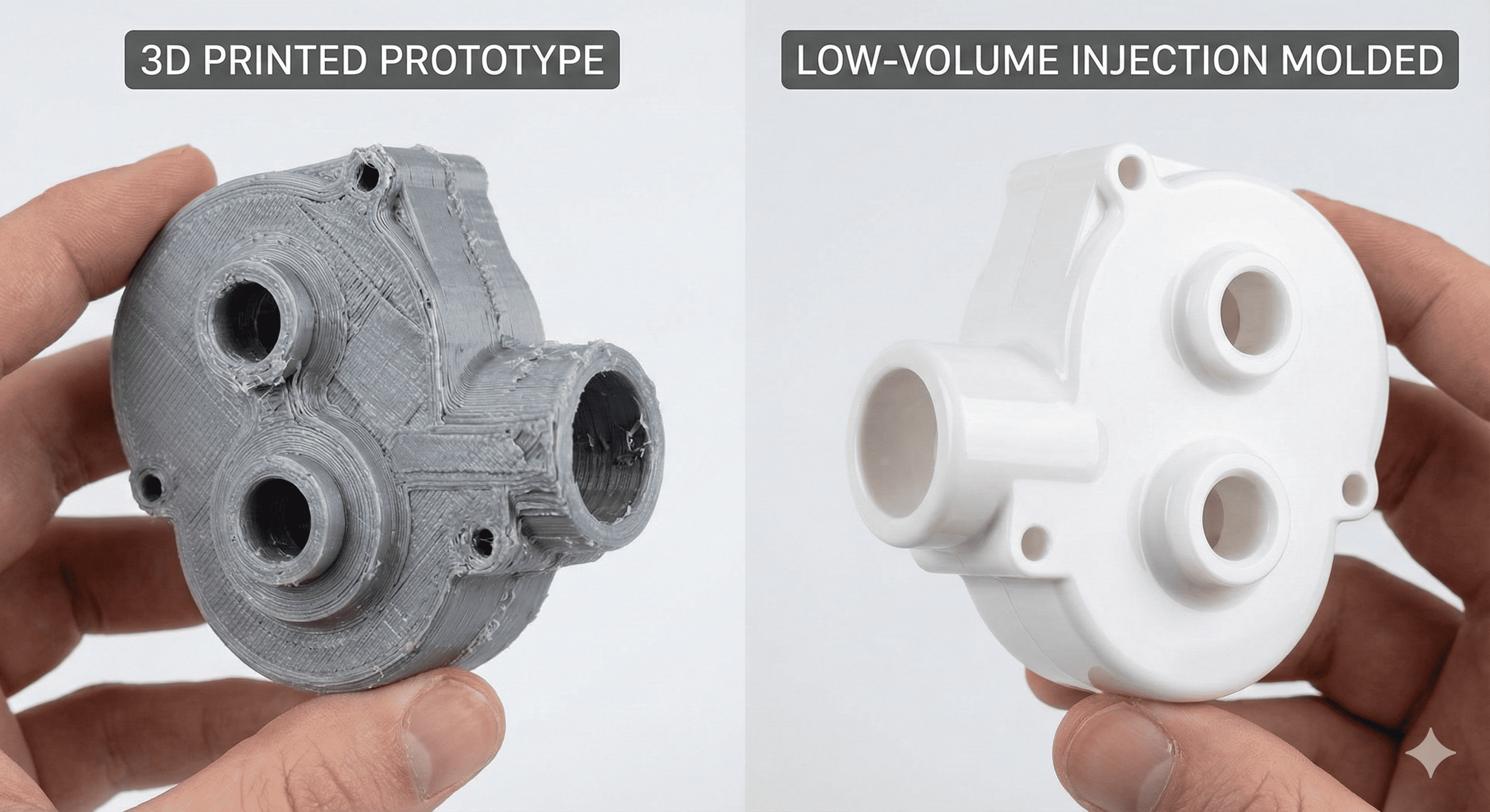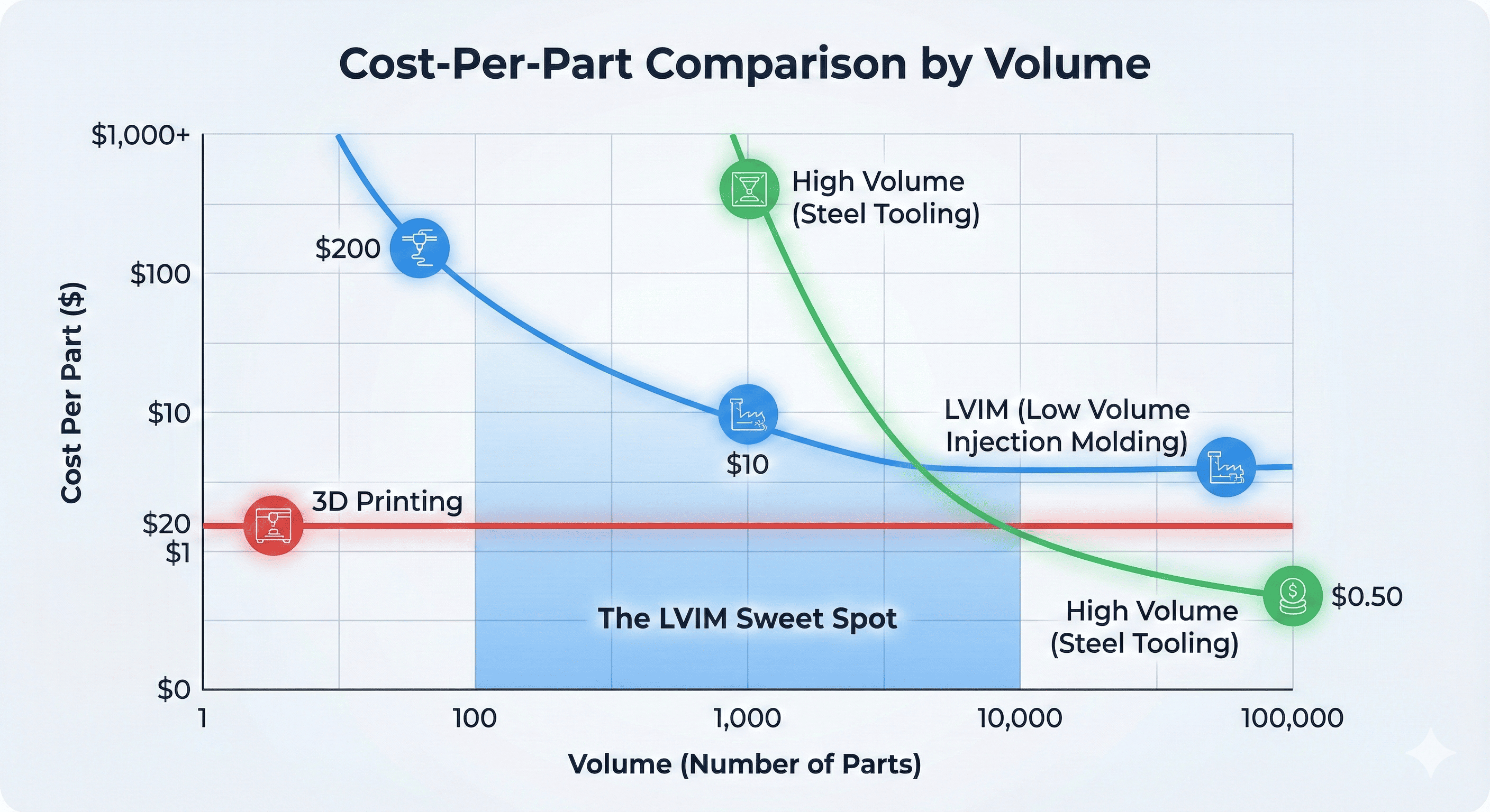 Hãy nghĩ theo cách này: in 3D giống như đi taxi. Nó thuận tiện cho một chuyến đi ngắn nhưng bạn sẽ không sử dụng nó để lái xe khắp đất nước. Đúc phun khối lượng thấp cũng giống như việc cho thuê một chiếc ô tô. Lúc đầu, có một số thủ tục giấy tờ và một khoản trả trước (chi phí khuôn mẫu), nhưng sau đó, mỗi dặm — hoặc mọi bộ phận — sẽ rẻ hơn đáng kể.