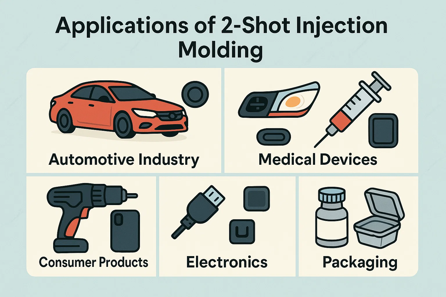 Sự kết hợp độc đáo của chức năng, thẩm mỹ và hiệu quả được cung cấp bởi việc ép phun 2 shot làm cho nó trở thành một phương pháp sản xuất ưa thích trên một phổ rộng của các ngành công nghiệp. Khả năng của nó để tạo ra một phần duy nhất, đa vật liệu trong một chu kỳ đã giải quyết các thách thức thiết kế và lắp ráp phức tạp, dẫn đến chất lượng sản phẩm và hiệu suất nâng cao trong các lĩnh vực sau.