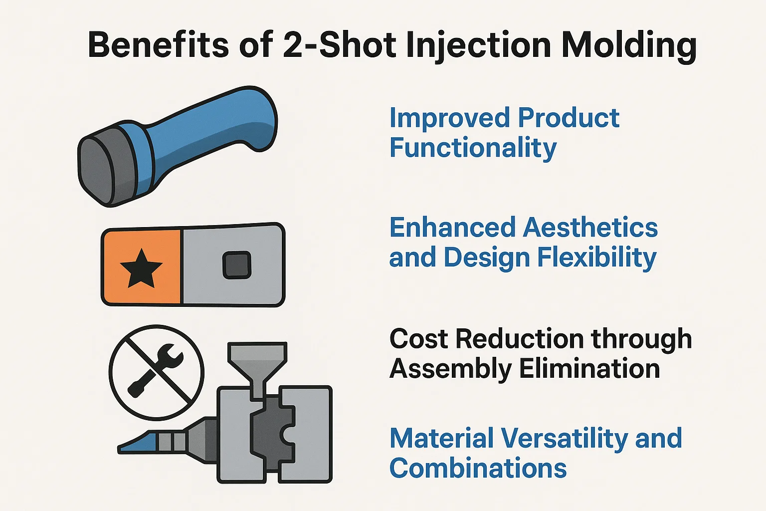 Một trong những ưu điểm quan trọng nhất của việc đúc 2 shot là khả năng tăng cường chức năng của sản phẩm bằng cách kết hợp các vật liệu với các tính chất khác nhau. Ví dụ, một loại nhựa nhiệt dẻo cứng có thể tạo thành thân cấu trúc của sản phẩm, trong khi chất đàn hồi nhiệt dẻo mềm (TPE) được đặt lên trên nó để tạo ra độ bám không trượt thoải mái. Kỹ thuật này rất cần thiết cho các công cụ điện, thiết bị điện tử tiêu dùng và các dụng cụ y tế nơi công thái học và cảm giác xúc giác là rất quan trọng. Hơn nữa, quá trình này rất lý tưởng để tạo ra các con dấu tích hợp, miếng đệm và bản lề sống, giúp cải thiện độ bền của sản phẩm, chống thấm và hiệu suất tổng thể mà không cần các thành phần riêng biệt có thể thất bại theo thời gian.
