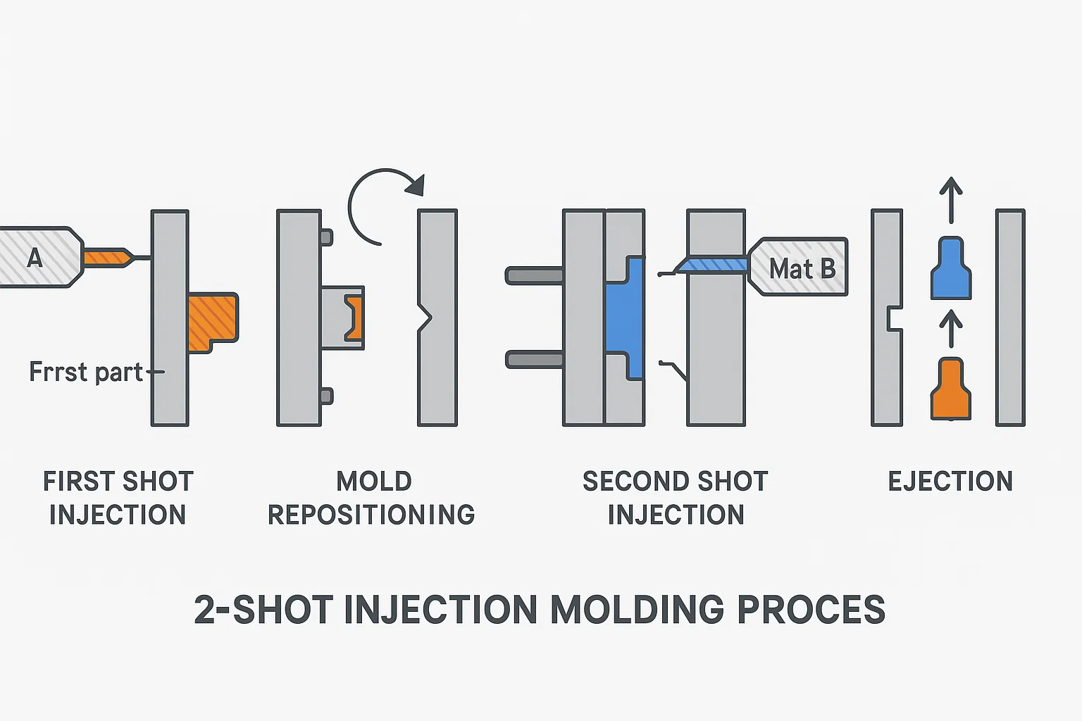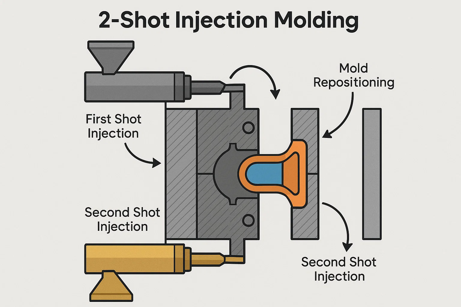 Hành trình của một phần đúc 2 phát bắt đầu với hai đơn vị tiêm riêng cho các vật liệu khác nhau vào một khuôn mẫu đơn, chuyên dụng. Quá trình mở ra như một chu kỳ đồng bộ: