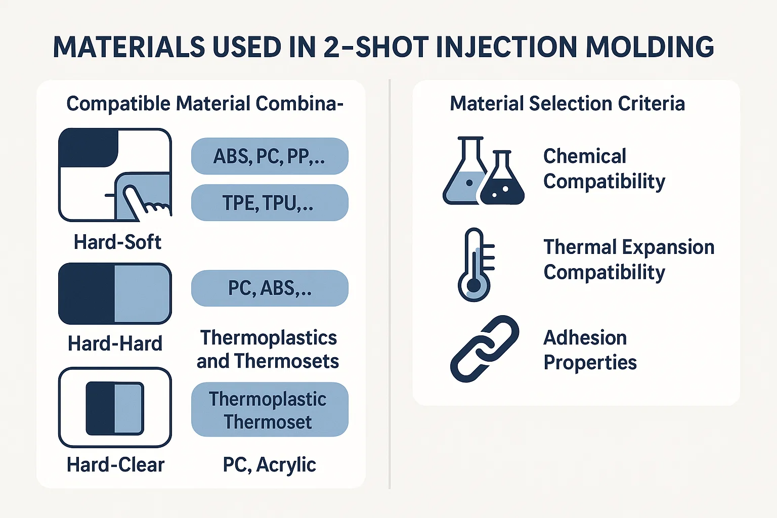 Thành công của bất kỳ dự án ép phun 2 shot nào dựa trên việc lựa chọn vật liệu cẩn thận. Hai polyme không chỉ phải đáp ứng các yêu cầu về chức năng và thẩm mỹ của sản phẩm cuối cùng mà còn tương thích với nhau để tạo thành một liên kết mạnh mẽ, lâu dài. Phần này khám phá các loại kết hợp vật liệu và các tiêu chí quan trọng để chọn chúng.