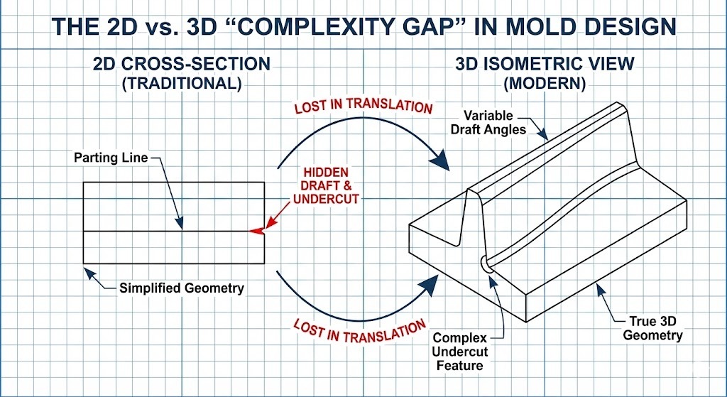 Trong khi thiết kế khuôn nguyên tắc cơ bản được xây dựng dựa trên bản phác thảo 2D, nhu cầu ngày càng tăng đối với các sản phẩm “hữu cơ” và hiệu suất cao đã bộc lộ những hạn chế của tư duy phẳng. Trong một thị trường cạnh tranh, việc dựa vào quy trình làm việc lấy 2D làm trung tâm truyền thống sẽ tạo ra “Trần phức tạp” cản trở sự đổi mới và làm tăng chi phí.