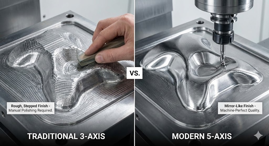 Trên máy 3 trục, việc cắt bề mặt cong sẽ dẫn đến hiện tượng “bậc thang”. Để khắc phục điều này, công nhân phải dành hàng giờ để băng ghế thủ công (đánh bóng). Máy 5 trục nghiêng dụng cụ để duy trì góc không đổi Chiều cao đỉnh (hoặc chiều cao hình con sò), tạo ra bề mặt mịn đến mức thường không cần xử lý hậu kỳ.